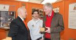 Lobedas Ortsteilbürgermeister Volker Blumentritt (SPD) informiert sich am Stand der Firma "Bauservice Bucha" über nachhaltiges Bauen. Sven Wirzbowitz und Martin Thoms (v.l.) sind mit ihrem Unternehmen erstmalig auf dieser Messe vertreten und möchte den Besuchern das Bauen mit Lehm vorstellen.